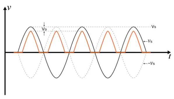 在確定在整流電路中使用哪些二極管時,需要考慮兩件事:1) 二極管處理電流的能力,必須根據(jù)二極管預(yù)期傳導(dǎo)的最大電流進行選擇,以及 2 ) 峰值反向電壓 (PIV),即二極管將承受的最高反向電壓;二極管必須能夠承受 PIV。看圖1.2(A),我們可以觀察到,當(dāng)電壓 v S 為負時,二極管將被截止,電壓 v O為零,導(dǎo)致二極管兩端的反向電壓為v S . 因此,PIV 是v S的峰值: